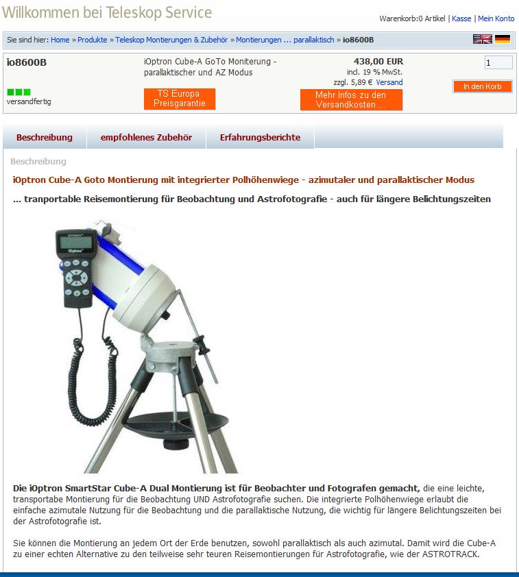 - iOptron Cube-A: EUR 438,– Inkl. Astro-Stativ, Nachführung AZ und EQ , dual-axis Servo-Motor, Gegengewicht als Zubehör, KEIN Polsucher, KEIN ST-4 (evtl. Adapter als Zubehör), 2.5 kg Zuladung EQ, GPS, GoTo, Handbox GoToNova 8401 mit USB-Schnittstelle für ASCOM, Vixen-Prismenklemme