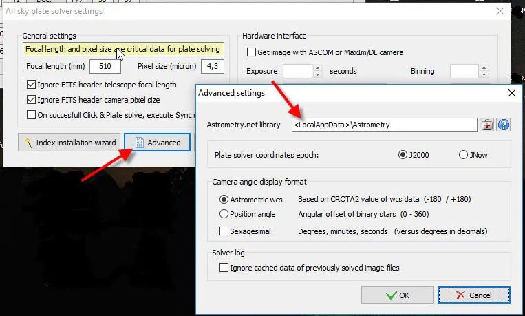 - In den “Plate Solver Settings” gibt es eine Schaltfläche “Advanced”. Dort stellen wir ein: