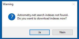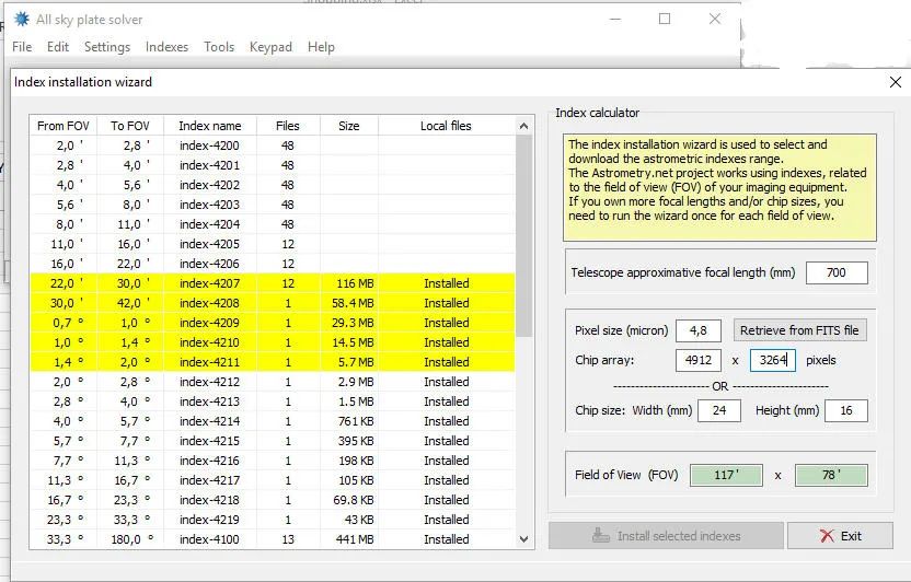 Dann prüfe ich, ob die Index-Dateien für diese Konfiguration (f=700mm, Pixel=4,8µ, Sensor=4912 x 3264) bereits geladen wurden. Dabei kommt es hier auf das Field of View (FoV) an. Wir brauchen dazu die Angaben f=700mm, Pixel=4,8µ, Sensor=4912 x 3264.