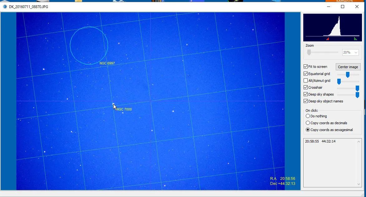 Nun kann ich das “gesolvte” Foto in einem Image-Browser betrachten: Schaltfläche “Browse solved image”. Mit JPG-Bildern hat das immer funktioniert, bei FITS-Bildern hat das aber leider nicht immer funktioniert – es könnte evtl. daran liegen, dass es unterschiedliche Varianten des FITS-Formats gibt.
