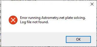 Ab und zu kann All Sky Plate Solver ein Foto nicht solven und bringt eine merkwürdige Fehlermeldung: Error running Astrometry.net plate solving. Log file not found.