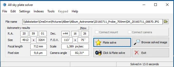 Wenn ich nun auf die Schaltfläche “Plate solve” klicke, beginnt der All Sky Plate Solver den Solving-Prozess und zählt seine Sekunden hoch. Wir haben alles richtig gemacht und es erscheinen nach 13,0 Sekunden die Ergebnisse des Solving: R.A. und Dekl. der Bildmitte, Kamera Winkel etc.: