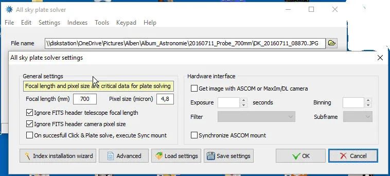 Zuerst stelle ich die Software “All Sky Plate Solver” auf mein Teleskop f=700 und die Pixel Size meines Sensors 4,8µ ein.
