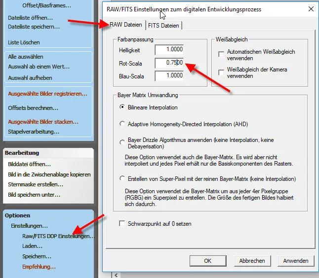 DSS Optionen – Einstellungen – Raw/FITS Einstellungen