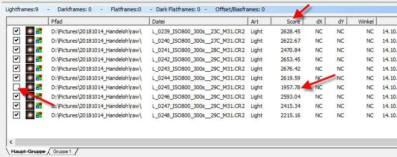 4. Beim Registrieren wird ein sog. “Score” berechnet. Evtl. sollte man “schlechte Einzelbilder” dann ausschließen…   (im Beispiel: L_245)