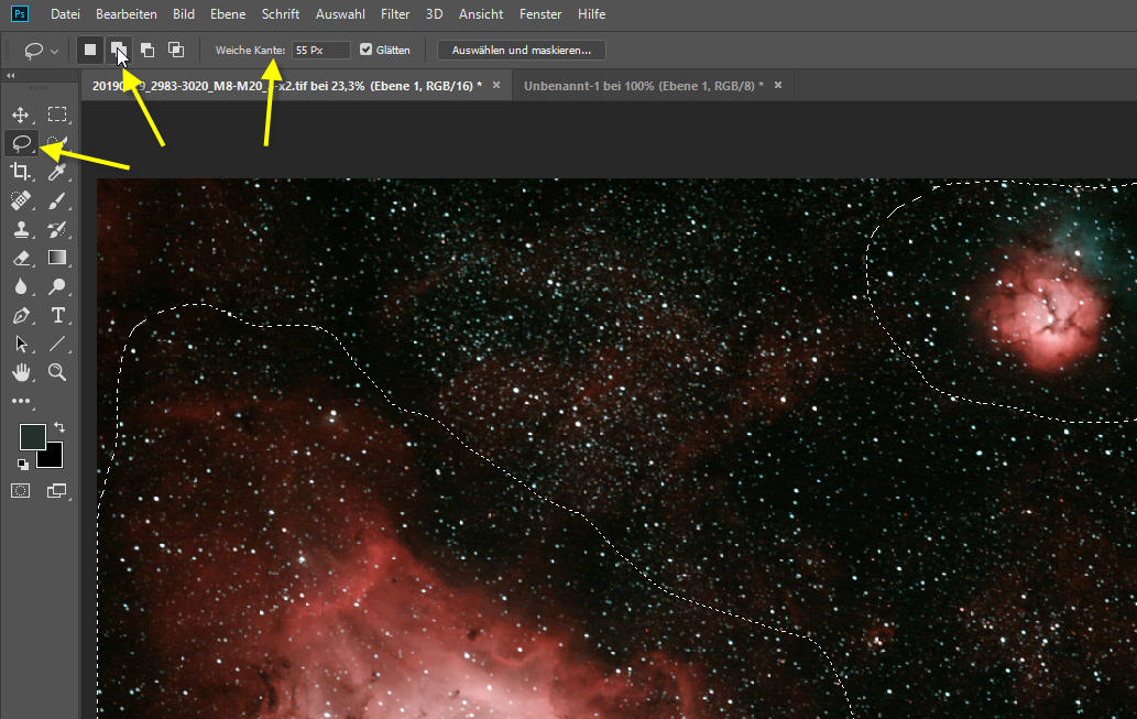 Weiche Auswahlkanten: Wenn die Auswahlkante nicht so scharf sein soll, kann man die Einstellung “Feather” z.B. auf 55 Pixel stellen.