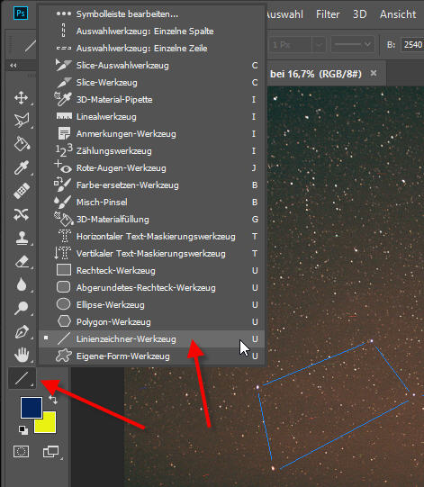 Ab und zu möchte ich in meine Astrofotos Linien zeichnen, um z.B. weitflächige Sternbilder hervorzuheben.