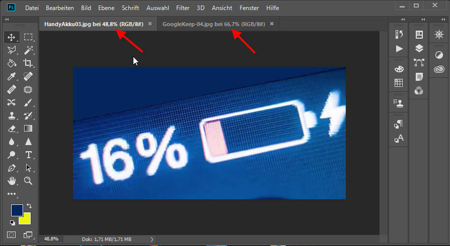 Wenn man mehrere Bilder geöffnet hat, erscheinen die als Tabs am oberen Rand.