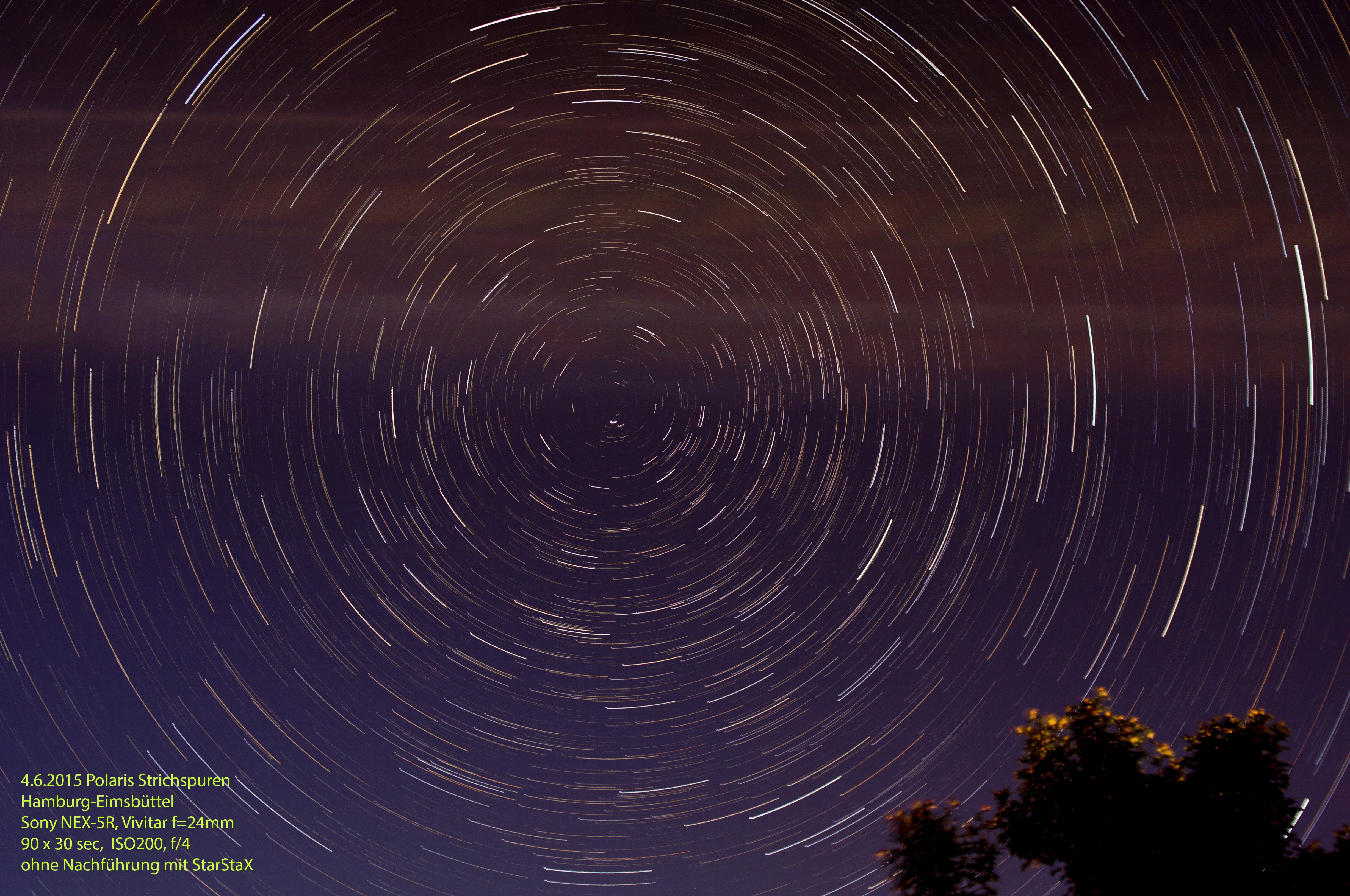 Abbildung 1: Konzentrische Strichspuren am Himmelspol (pCloud: DK_20150604_05307-05396_StarStaX_gap_filling_beschriftet.jpg)