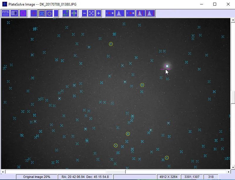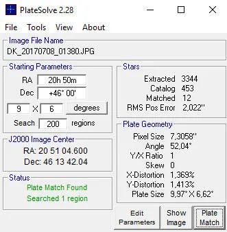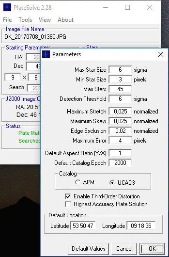 Das PlateSolve2 leistet kein “blind solving”, sondern erfordert die Angabe eines “ungefähren” Ausgangspunkts (R.A. und Dekl.) sowie die Angabe des Gesichtsfeldes (z.B. 9° x 6°).