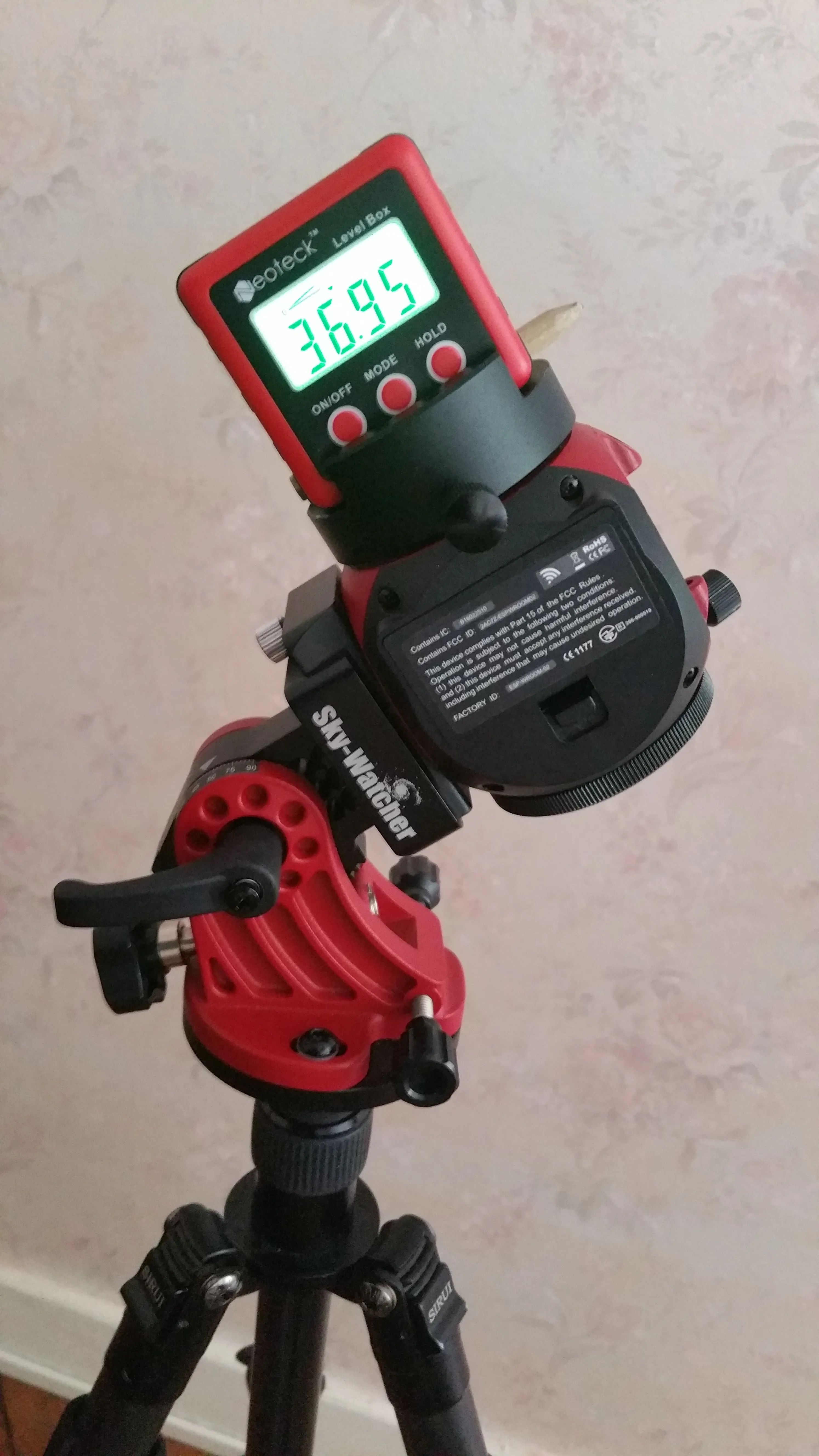 Von dem Astro-Kollegen Frank auf Kiripotib bekam ich den Tipp, doch einen digitalen Neigungsmesser zu verwenden, um die Polhöhe im Vorwege genau richtig einzustellen.