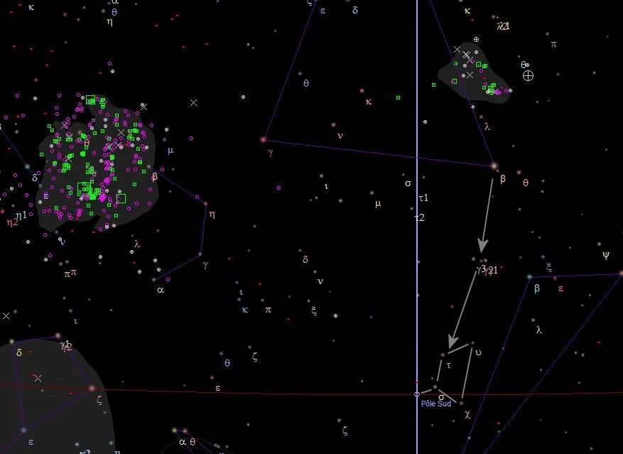 Da die Gegend um den Himmelssüdpol keinerlei hellere Sterne aufweist, beginnen wir das Aufsuchen mit einigen markanten, helleren Objekten: LMC, SMC, 47 Tuc, Beta Hydri und “hoppen” von Beta Hydri aus über Gamma-1-2-3 Octantis zum Trapez aus Sigma, Tau, Chi, Ypsilon Octantis.