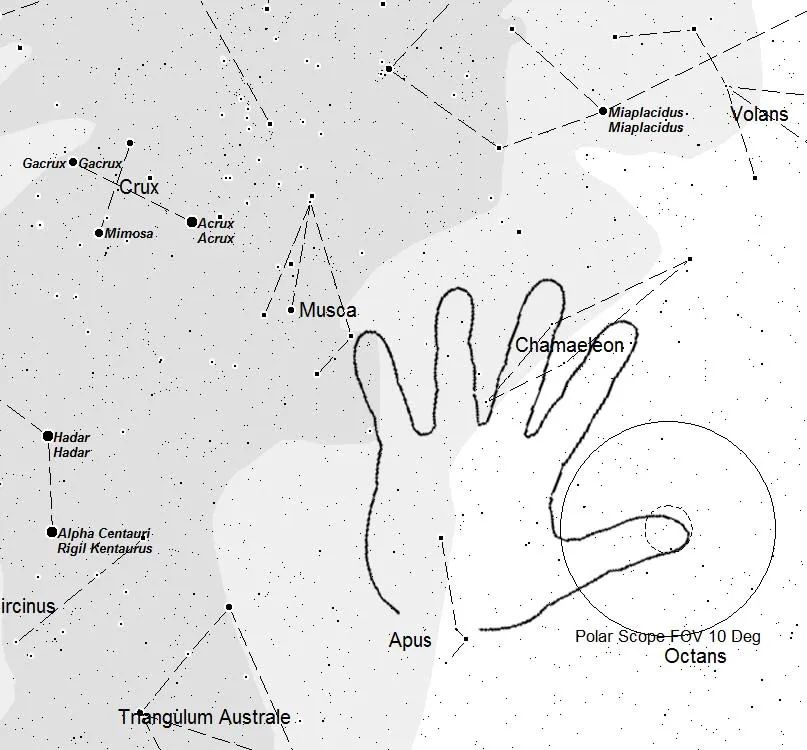 Im user manual des Star Adventurer wird eine Methode zum “coarse alignment” beschrieben, die von dem Stern Acrux (alpha Crucis) ausgeht, dann geht man zu Alpha Muscae und weiter zu Gamma Musca (ist der nächst-hellste Stern). Die gerade Linie von Acrux über Gamma Mus zeigt genau zum SCP. Der Abstand auf dieser geraden Linie zum SCP  ist etwa ein gespreizte Hand breit.
