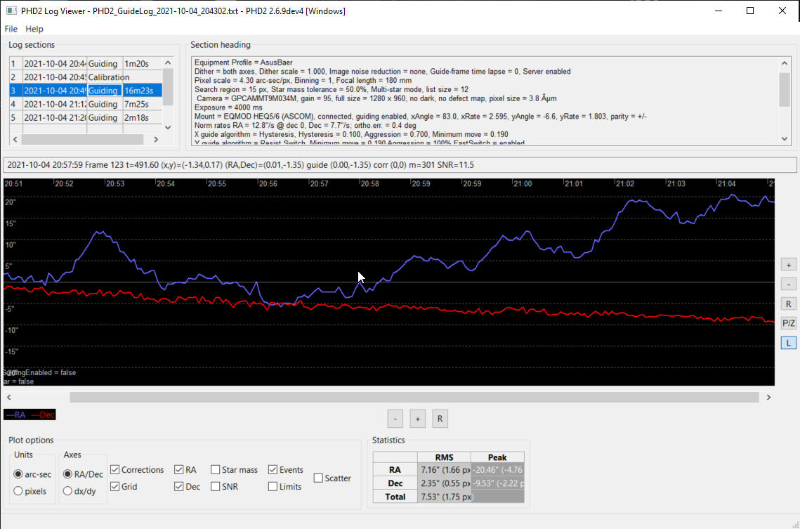 Im obigen Beispiel zeigt die rote Kurve, die Abweichung des Trackings in Deklination an. Da haben wir also einen leichten gleichmäßigen Abwärtstrend. Dieser Deklinations-Drift beträgt etwa 0,6 Bogensekunden pro Minute. Das kommt wohl durch einen kleinen Fehler in der Polausrichtung.