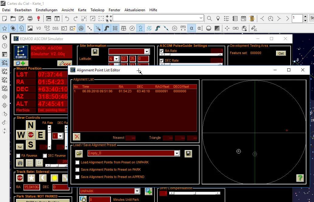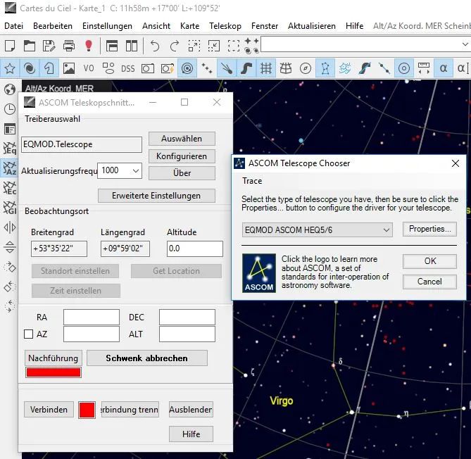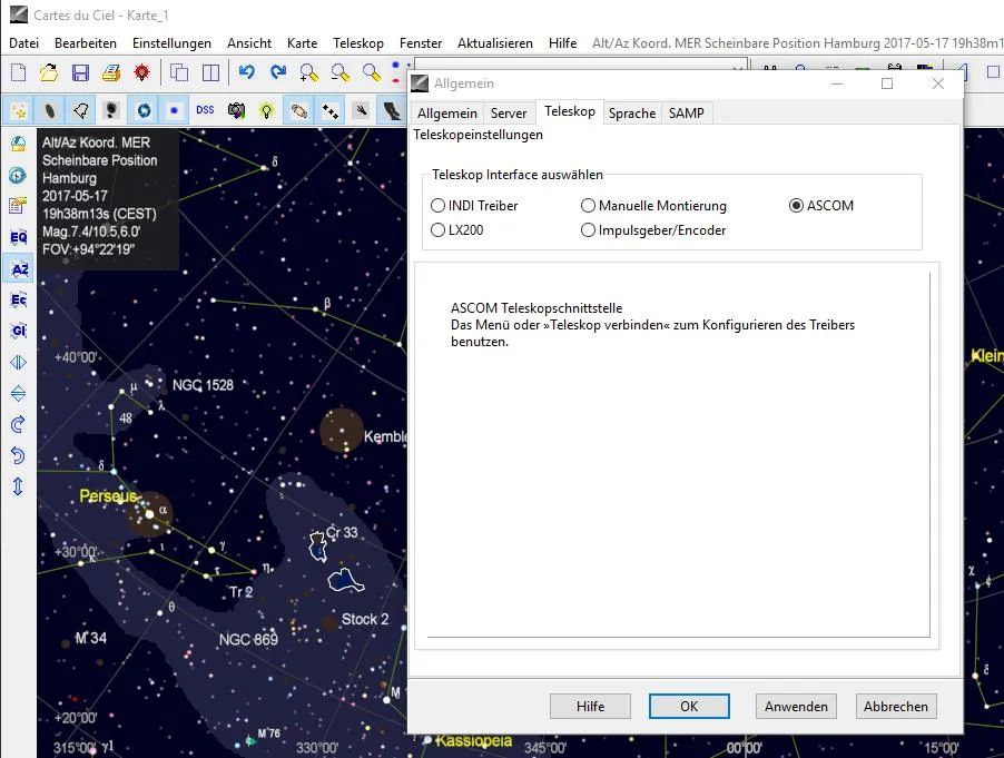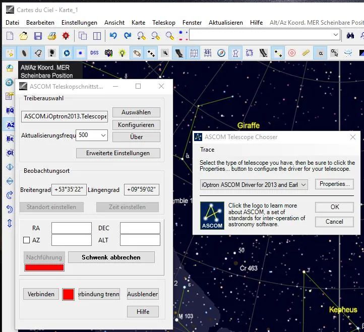 Cartes du Ciel: Teleskopsteuerung über ASCOM