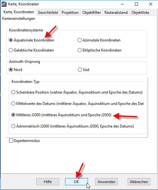Bildbeschreibung: CdC Menüleiste –> Einstellungen –> Karte, Koordinaten –> Koordinatensystem: Radiobutton “Äquatoriale Koordinaten” & Koordinaten-Typ Radiobutton ” Mittleres J2000 (…)” & Schaltfläche “OK”