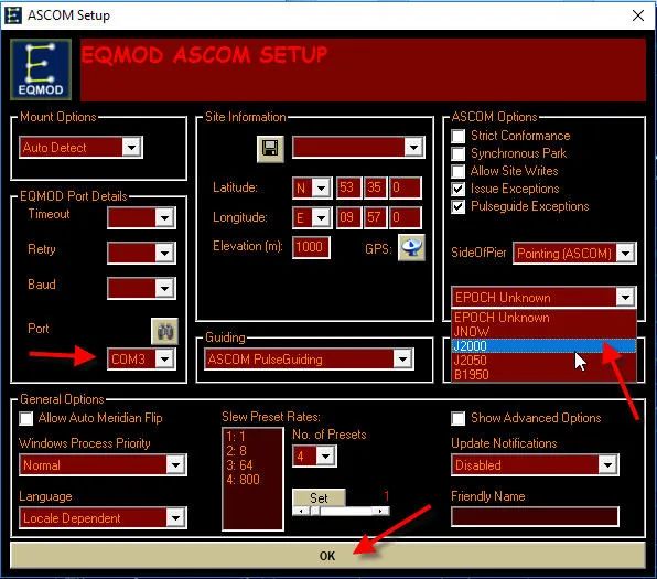 Abbildung 4: ASCOM SETUP -> Drop-Down “Epoch”: J2000 & Schaltfläche “OK” (pCloud: Cartes-du-Ciel-12.jpg)