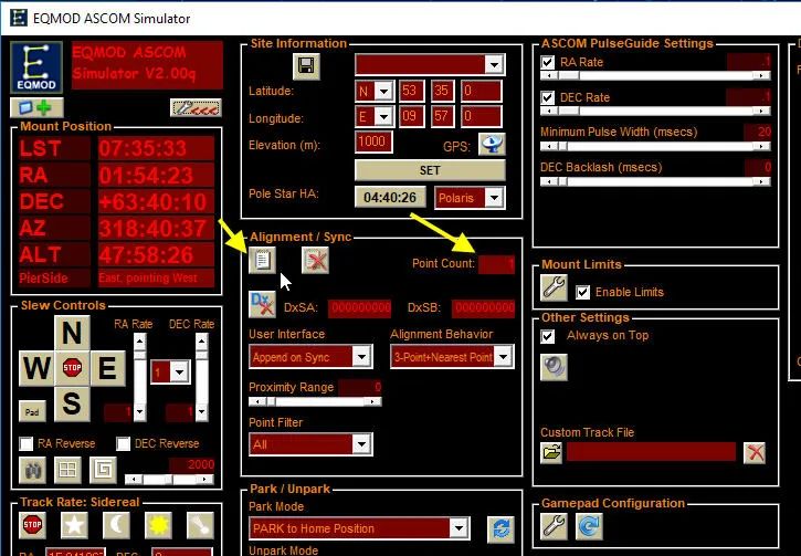 Dann sieht man im nach rechts aufklappenden erweiterten EQMOD-Fenster im Bereich “Alignment / Sync” unter “Point Count” (rechter Pfeil) die Anzahl der gesetzten Alignment-Points und man kann sich durch klicken auf “Point List” (linker Pfeil) die Liste der Alignment-Points im Detail anzeigen lassen.