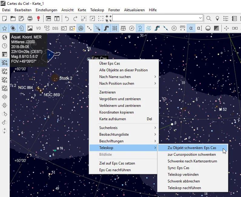 Abbildung 9: CdC Mausklick rechts auf einen Stern (z.B. Eps Cas) -> Popup “Teleskop” -> Popup “Zu Objekt schwenken Eps Cas” (pCloud: Cartes-du-Ciel-20.jpg)