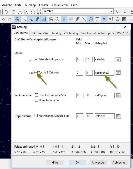- Allerdings müssen die anzuzeigenden Sterne in einem eingebundenen Sternkatalog (s.u.) enthalten sein.