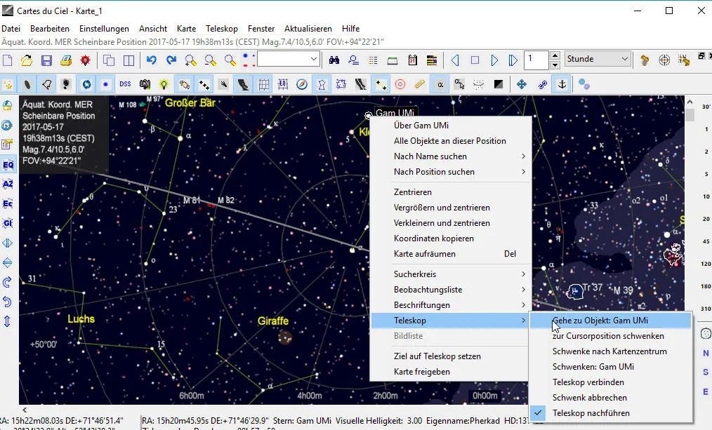 Abbildung 8: CdC Mit der Maus auf einen Stern (z.B. Gam UMi) zeigen und Rechtsklick -> Popup: “Teleskop” -> Popup: “Gehe zu Objekt Gam UMi” (pCloud: CdC-04.jpg)