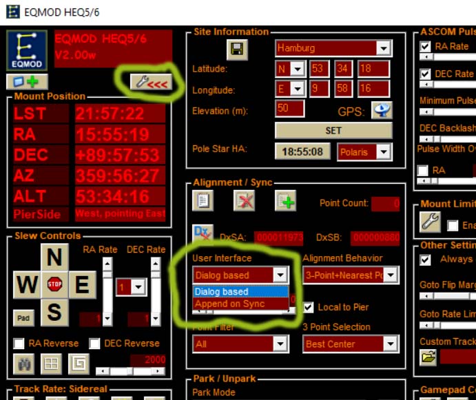 Wenn wir ganz bewusst den einen oder anderen SYNC-Point in das EQMOD-Alignment-Modell aufnehmen wollen, können wir gezielt für so einen einzelnen SYNC-Point das EQMOD auf “Append on SYNC” umstellen, dann den SYNC machen und danach wieder auf “Dialog based” zurückstellen.