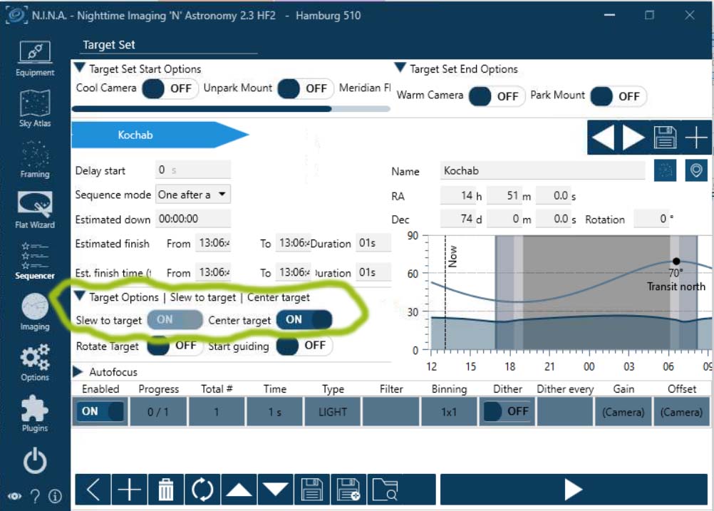 Da ich abgespeicherte Targets nur im N.I.N.A.-Sequencer wieder laden kann, muss ich zum Slew auf ein abgespeichertes Target den N.I.N.A. Sequencer verwenden. Am besten gebe ich in der Target-Zeile (Entry) dann Null an, damit beim Starten der Sequenz nur noch die “Target Options” (Slew etc.) ausgeführt werden.