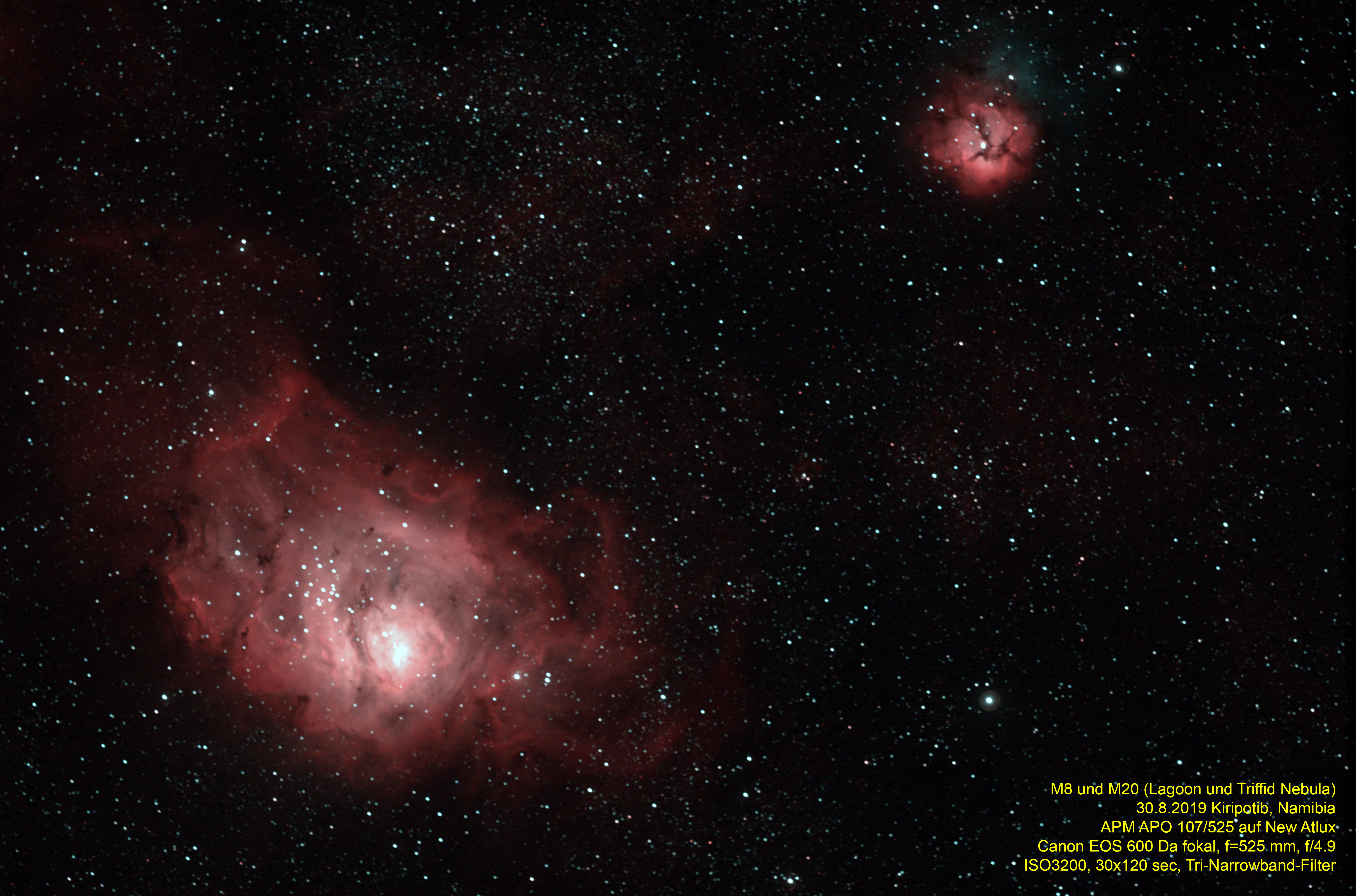 Bei meinem ersten Aufenthalt in Namibia im September 2017 habe ich erste Fotos von M8 und M20 erstellen können. Zwei Jahre später 2019 habe ich es dann noch schöner mit einem Tri-Narrowband-Filter gemacht: