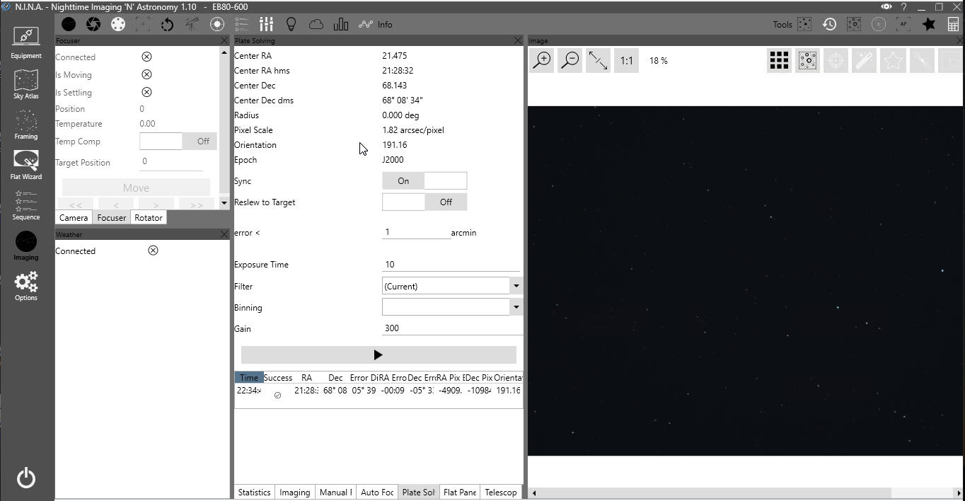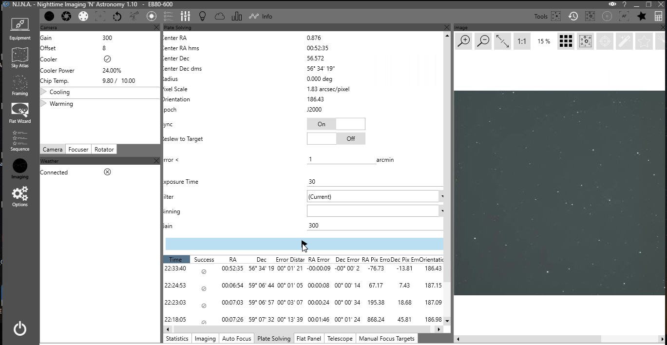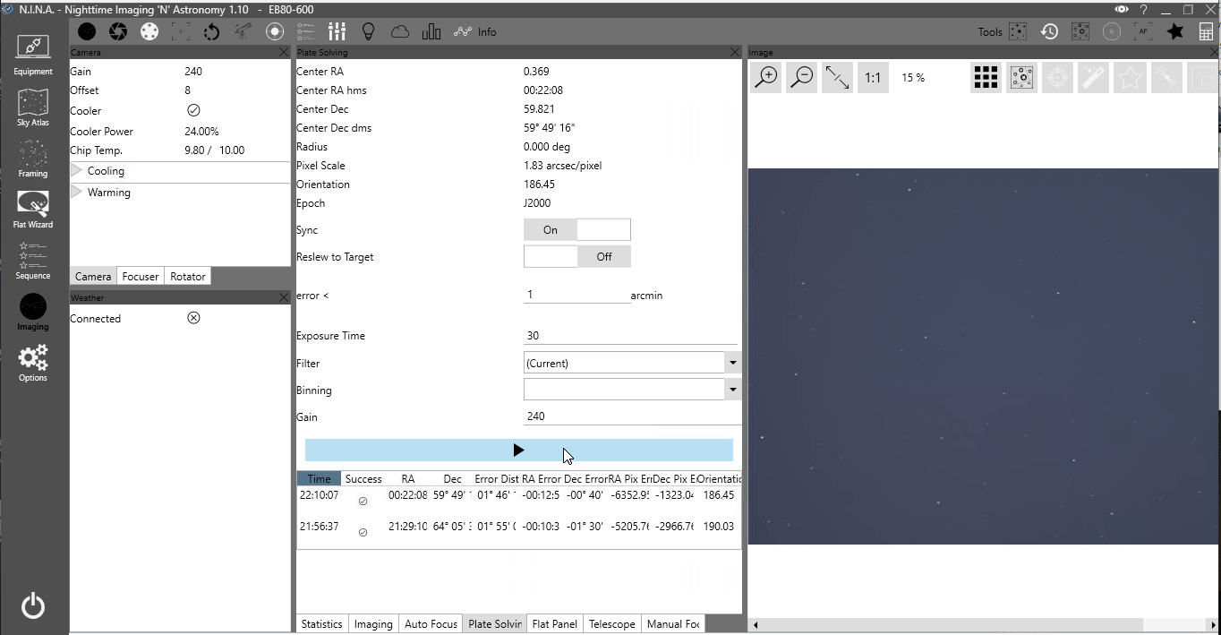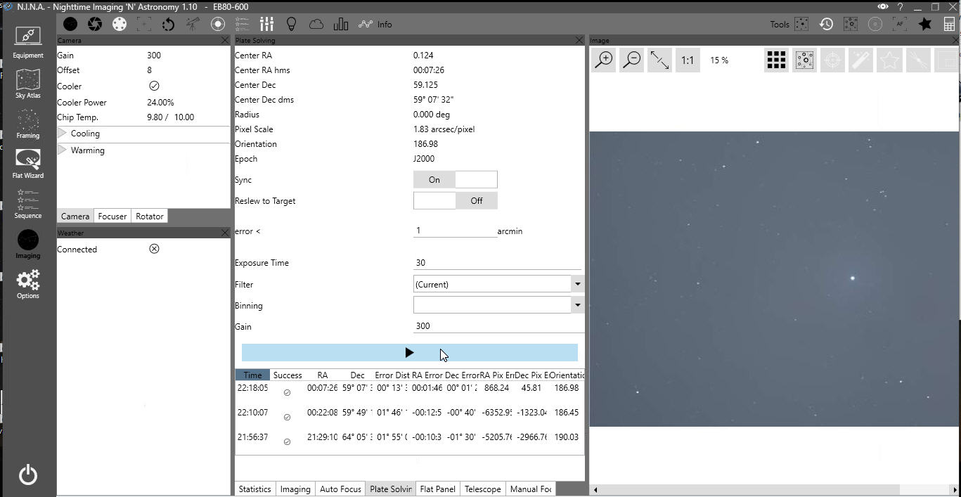 Achtung: Bei N.I.N.A. gibt es die Besonderheit, dass die Funktion “Platesolve” selbständing ersteinmal ein Foto schiesst, Also Belichtungszeit und Gain dafür nochmals eingeben….