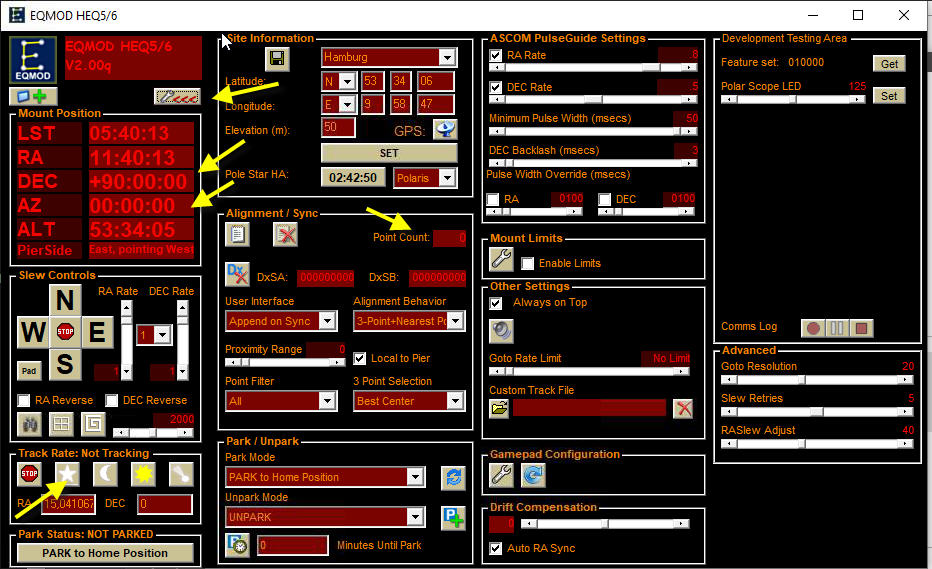 - Kontrolle: Anzeige zeigt: Deklination 90,0 Grad und Azimut Null Grad (das ist wichtig für das erste “Goto” bzw. “Slew”, wie es in N.I.N.A. heisst).