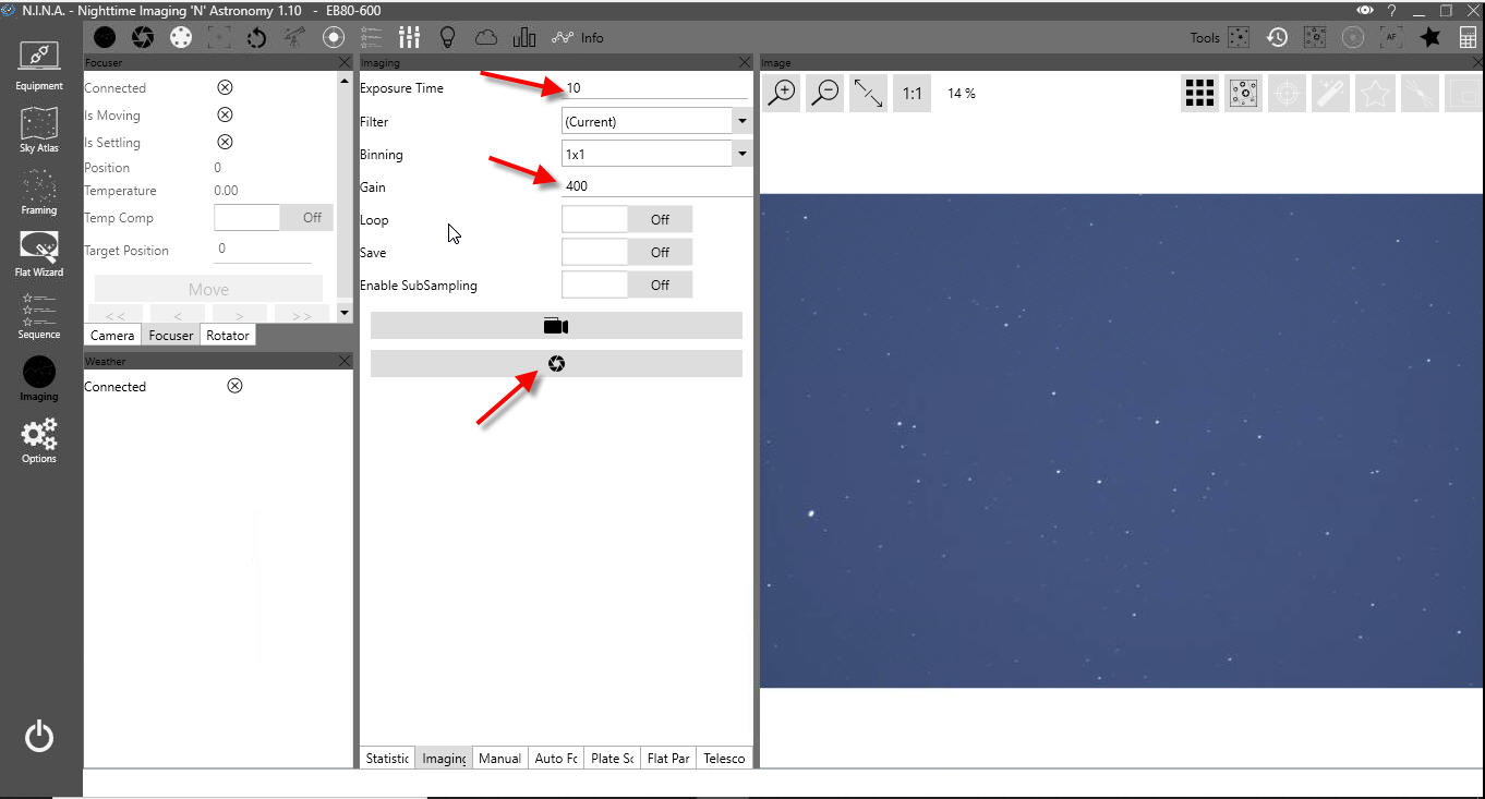 - In N.I.N.A. auf den Reiter “Imaging” gehen und ein Foto machen (dazu Belichtungszeit und Gain so einstellen, das Sterne zu sehen sind).