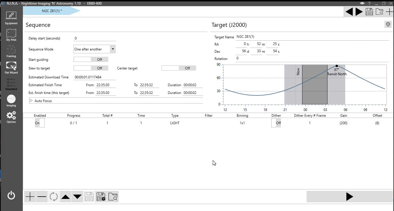 Nachdem ich auf die neue Astro-Software N.I.N.A. aufmerksam geworden bin, möchte ich mal zum Test nachstellen, ob und wie ich mit N.I.N.A. mindestens das Gleiche machen kann, wie mit APT.