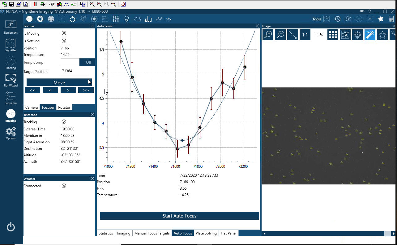 Dann aktivieren wir in N.I.N.A. das Fenster “Auto Focus” und klicken dort auf “Start Auto Focus”. Damit beginnt N.I.N.A. eine Messreihe wobei der Fokusser bewegt wird und bei jeder Fokusser-Position ein Foto gemacht wird und auf dem Foto der HFR der Sterne bestimmt wird. Das ganze wird dann grafisch dargestellt: