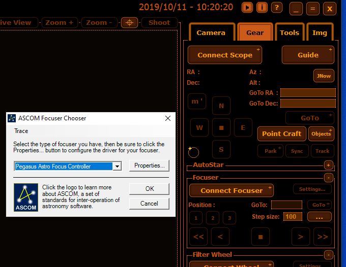 Im ersten Schritt wählen wir den (zuvor installierten) ASCOM-Treiber für das Gerät (Pegasus Astro Focus Controller) aus. Danach müssen wir auf die Schaltfläche “Properties…” klicken.