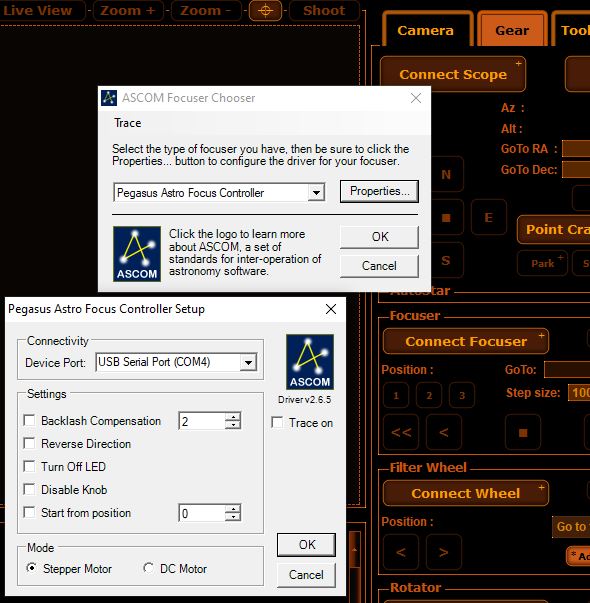 Unten können wir den Motor Mode einstellen, denn wir haben ja einen “Dual Motor Focuser”. “Stepper Motor” ist hier die bessere Einstellung, weil dann der Focuser-Motor in Schritten, die als Zahlen angezeigt werden, bewegt werden kann.