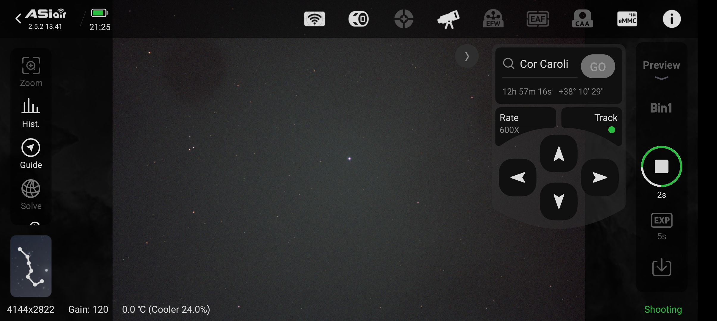 Schritt 1: Manuelles Anfahren eines geeigneten Himmelsausschnitts (wo mehrere Sterne sind) mit der ASIAIR-App. Ich habe mir als Himmelsausschnitt die Gegend um den Stern Alpha Canes Venatici (Cor Carolis) ausgesucht.