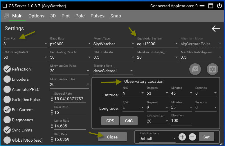• GS Server so wie es oben schon sichtbar ist – damit kann ich z.B. die Tracking Rate einstellen