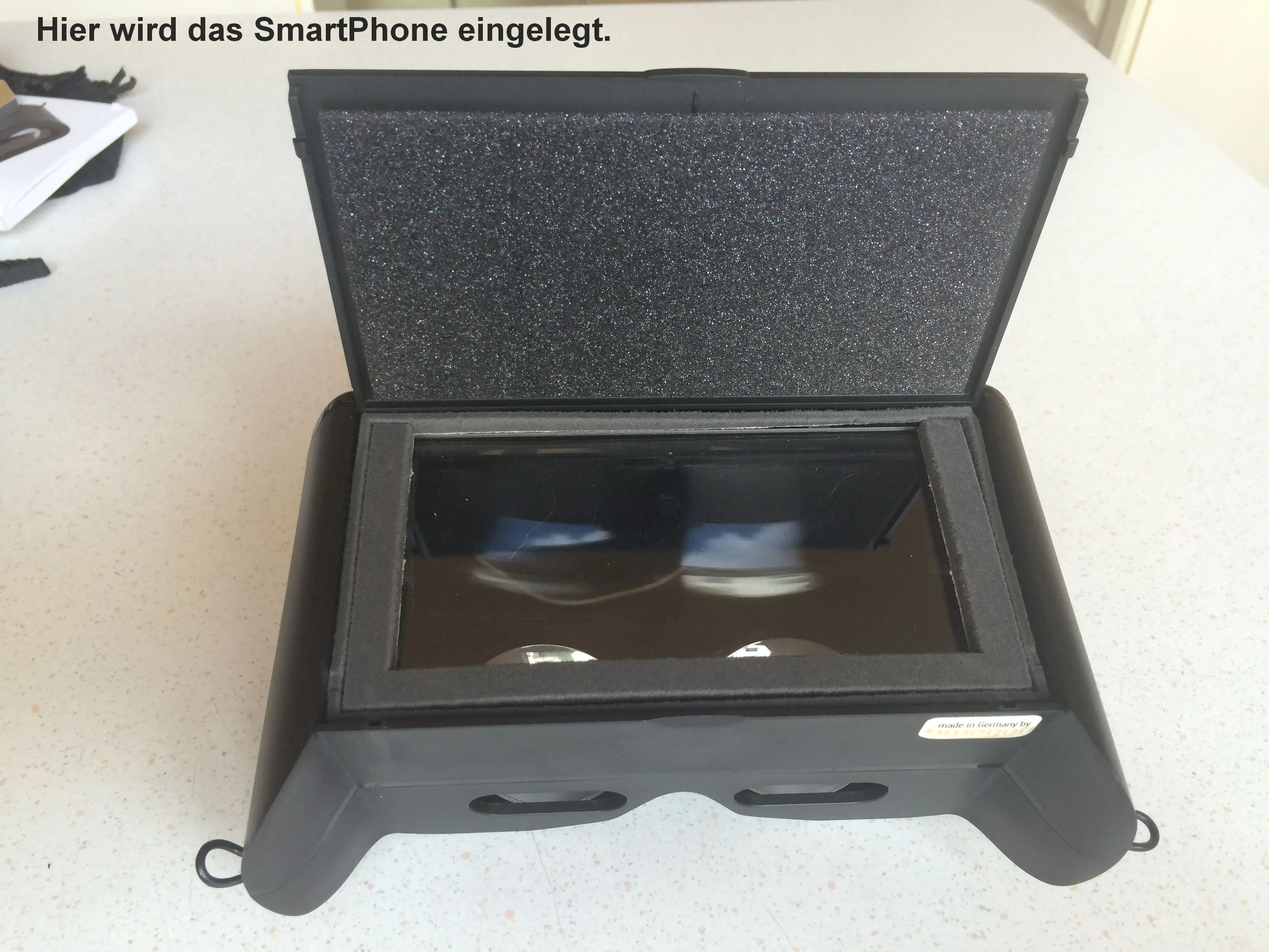 Dann das SmartPhone mit dem Display nach unten und in Pfeilrichung nach vorn in das obere Fach des Geräts einlegen. Es können verschieden große SmartPhones eingelegt werden und mit Schaumstoffstückchen fixiert werden.
