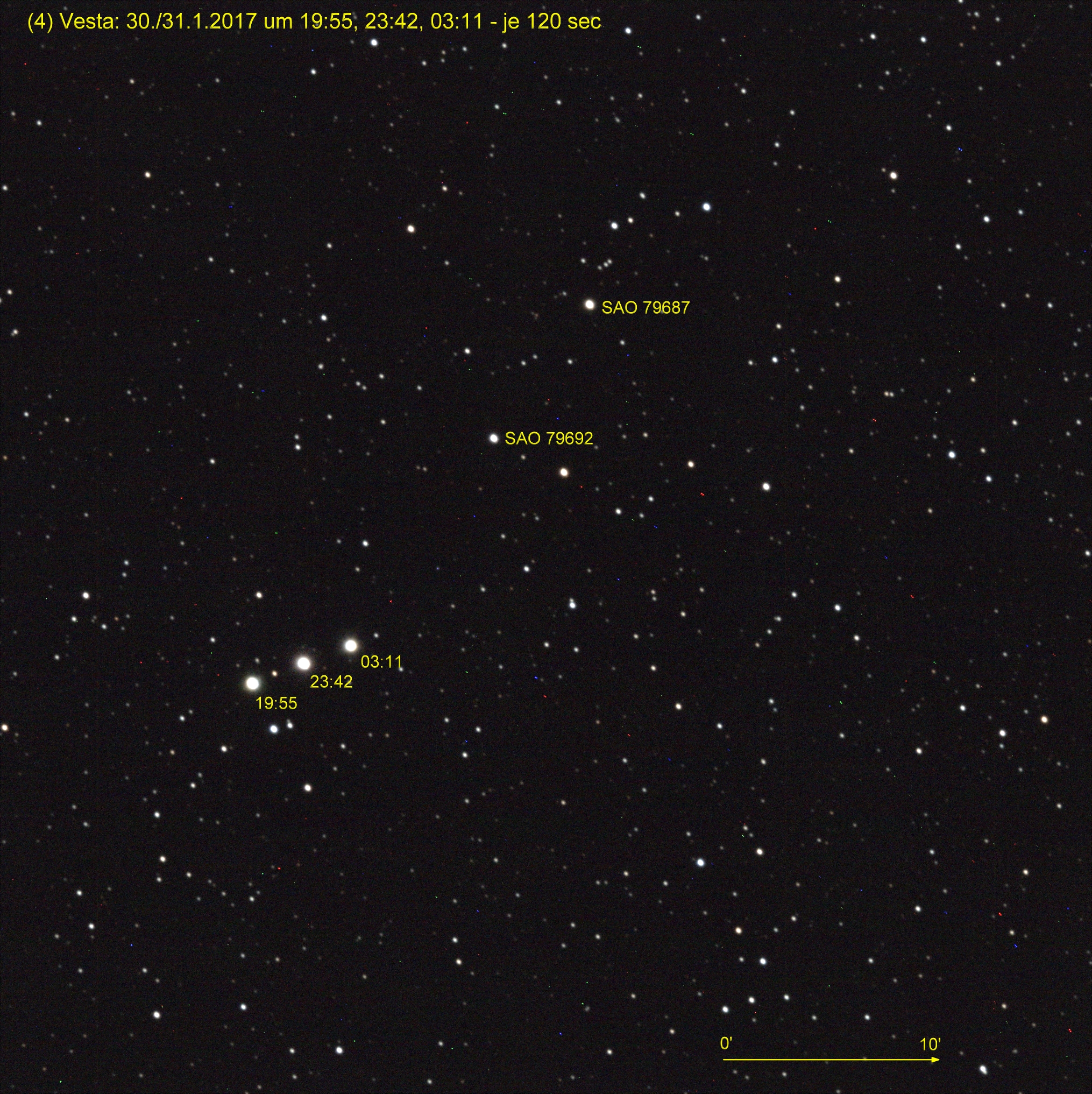 Im Januar 2017 stand der Kleinplanet Vesta in Opposition und konnte von Hamburg aus gut beobachtet werden. Die scheinbare Helligkeit von Vesta liegt dabei so um 6,5 mag (am 30.1.2017) .