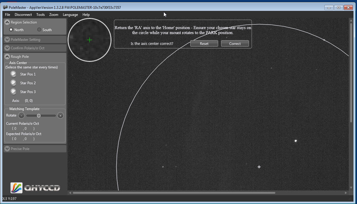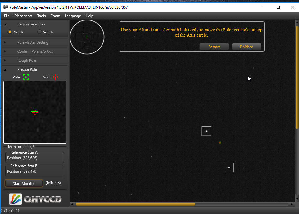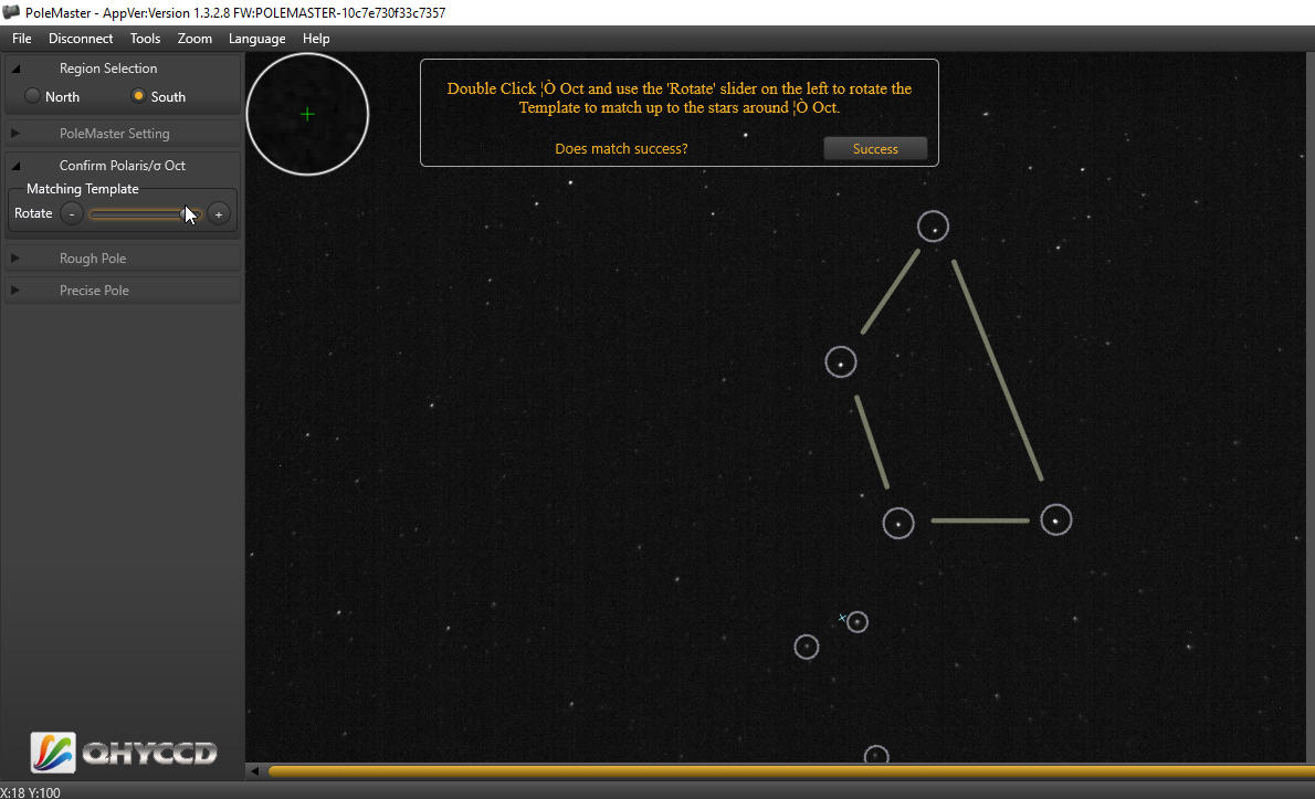 Sowohl beim Polfernrohr als auch beim QHY PoleMaster muss man Gegend des Himmelspols (Nord bzw. Süd) eindeutig im FoV auffinden können. Was beim Südpol nicht so einfach ist, weil es keinen hellen Polarstern am Südpol gibt (Sigma Octantis ist 5,45 mag hell).