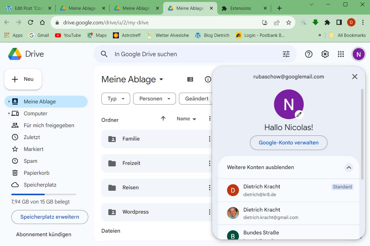 Im ersten Schritt werde ich also meine Medien-Dateien auf Google Drive speichern. Dabei ist wichtig, welchen meiner Google-Accounts ich dafür verwende: rubaschow@googlemail.com.