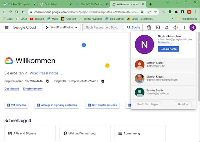 Jetzt muss eine Anmeldung am “richtigen” Google-Konto aktiv sein; dann sieht man diejenigen “Projekte”, die zu diesem Google-Konto gehören.