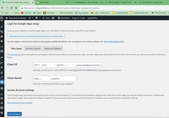 Die so erhaltenen zwei Daten “Client-Id” und “Client Secret” tragen wir in den Settings des Plugins “Login for Google Apps” wie folgt ein: