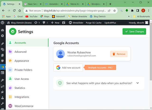 Zum Abschluss dieser (einmaligen) Einrichtung der WordPress-Plugins müssen wir noch dem Plugin “Integrate Google Drive” sagen welches Google-Konto es benutzen soll (mehrere Google-Konten wären kostenpflichtig).