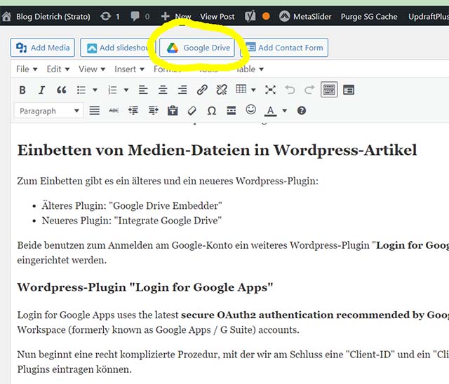 Da zu habe ich das WordPress-Plugin “Integrate Google Drive” installiert. Danach erscheint beim Editieren eines jeden WordPress Artikels in der oberen Leiste eine Schaltfläche “Google File” (in der Reihe: Add Media, Add slider, Google File, Add Contact Form):