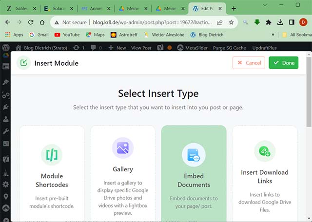 Wenn ich auf diese Schaltfläche “Google File” klicke, öffnet das Plugin zunächst ein Fenster “Select Insert Type”, wo ich “Embed Document” auswähle. Danach wird der oberste Ordner “Meine Ablage” von Google Drive (meines festgelegten Google Kontos) angezeigt..