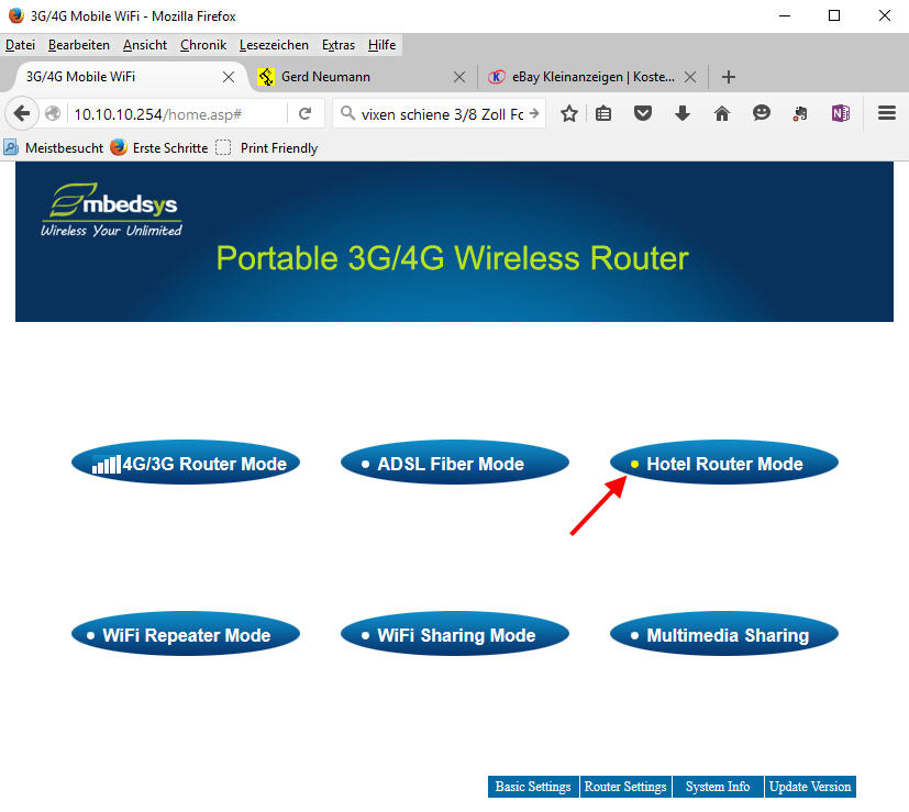 - Seite im Internet-Browser neu laden. Nun sollte nur das Oval “Hotel Router Mode” einen gelben Punkt haben und die anderen Ovale nicht, so wie in diesem Bild:
