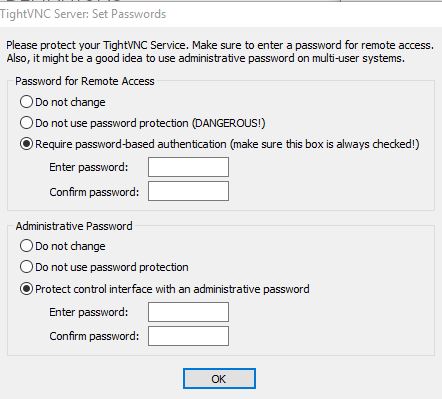 Bei der Installation des TightVNC-Servers können auch Passwörter festgelegt, die beim Aufbau einer Remote-Verbindung anzugeben sind. TightVNC fordert keine Windows-Anmeldung.