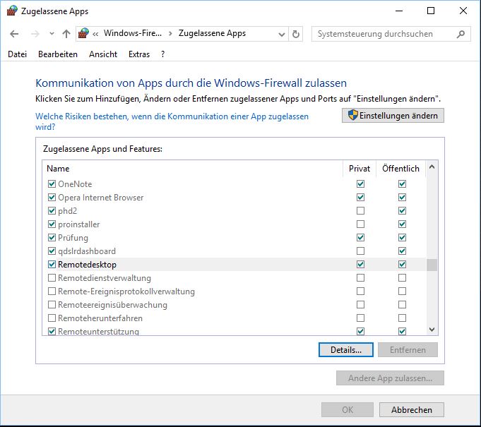 Wenn man auf diese Weise die Remotedesktop-Verbindung zugelassen hat, werden automatisch die erforderlichen Freischaltungen in der Windows Firewall vorgenommen. Dies kann man nachkontrollieren: Systemsteuerung -> System und Sicherheit -> Windows-Firewall -> Apps über die Firewall kommunizieren lassen (“zulassen”):
