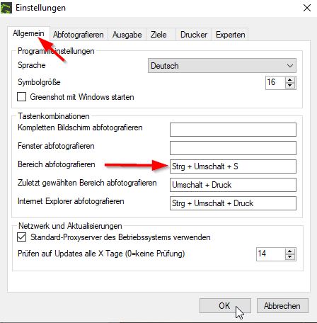 Die Tastenkombinationen für Greenshot können unter dem Reiter “Allgemein” eingestellt werden. Allerdings, wenn eine Tastenkombination bereits anderweitig belegt ist, gibt es ein Problem z.B. wird das bei der Taste “PrintScreen” der Fall sein…